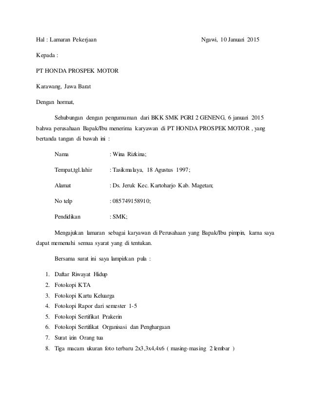 Surat lamaran marketing sektor industri untuk pt. Pengalaman kerja saya sebelumnya di pt penta artha impressi sebagai teknisi selama 4 tahun. Berkenaan dengan informasi lowongan kerja guru bahasa inggris di smk nusantara madiun, maka bersama ini saya ingin mengajukan surat permohonan lamaran kerja. Contoh surat kerja untuk yang berpengalaman. Contoh surat lamaran kerja lulusan smk fresh graduate. Nama saya agung ariftianto, pria usia 26 tahun, telah menyelesaikan pendidikan jurusan bahasa dan sastra inggros di universitas negeri semarang pada tanggal 11 september 2016 dengan ipk 3.61. Syarat kerja di pt juga tidak membutuhkan lulusan sarjana. Contoh surat lamaran kerja di pt astra group have a graphic associated with the other.contoh surat lamaran kerja di pt astra group in addition, it will feature a picture of a kind that might be observed in the gallery of contoh surat lamaran kerja di pt astra group. Berikut ini beberapa contoh surat lamaran kerja secara umum dan contoh surat lamaran simple sesuai dengan jenis profesi yang anda pilih, seperti di bawah ini: Yth, hrd pt mukadimah nusantara. Dengan hormat, sesuai dengan kabar yang saya dapatkan dari website resmi pln terkait lowongan kerja di pt pln (persero), maka dengan ini saya mengajaukan diri untuk bergabung dengan tim marketing di pt. (untuk memperbesar gambar, silakan di klik) download doc | pdf. Medan merdeka no 15, jakarta pusat.
